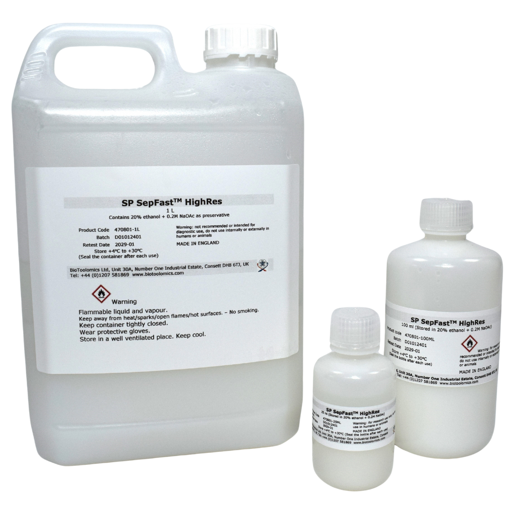 Q (DEAE, S, CM) SepFast™ HighRes is a group of ion-exchange chromatography media with reduced bead size (20 – 50 μm). They are specially designed for high resolution purification of biological molecules in which impure components are hard to separate by normal bioprocessing chromatography media.