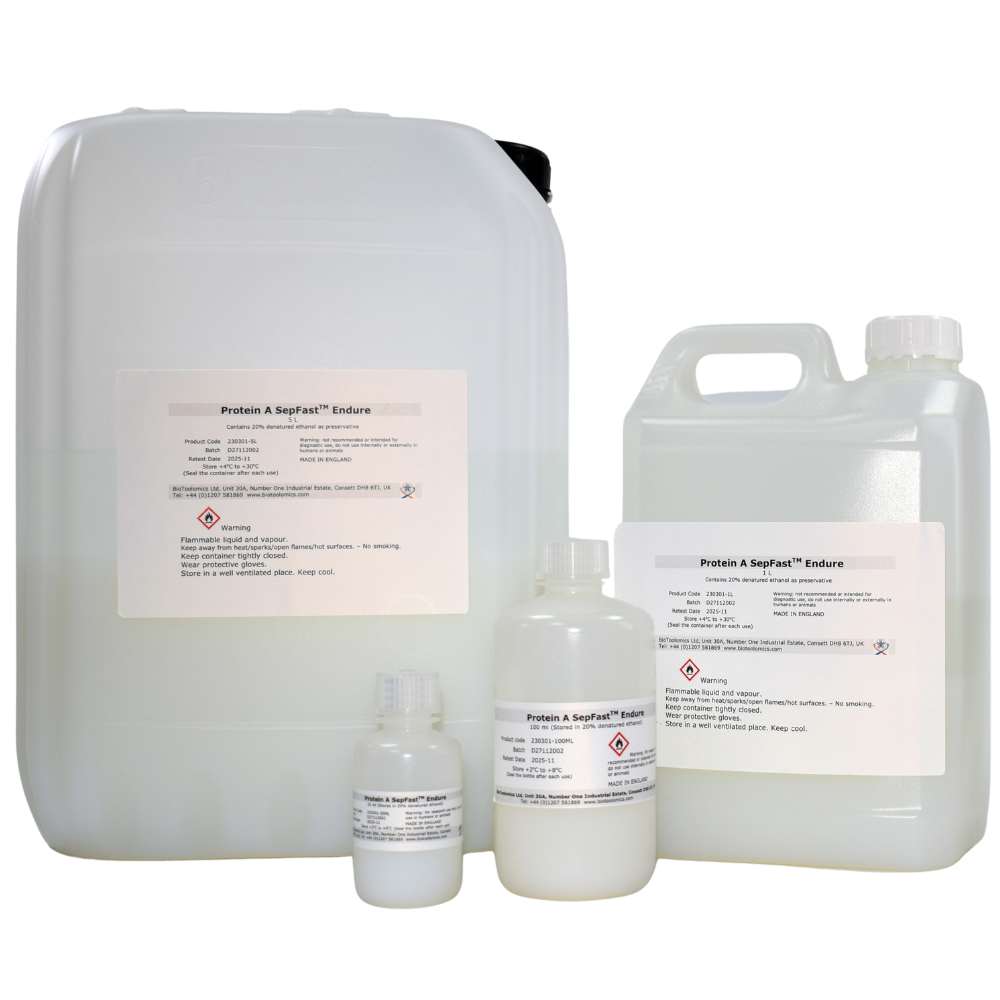 - Protein A SepFast Endure: 50 – 150 µm, more alkaline-stable than Protein A SepFast, can be cleaned with 0.5 M NaOH;